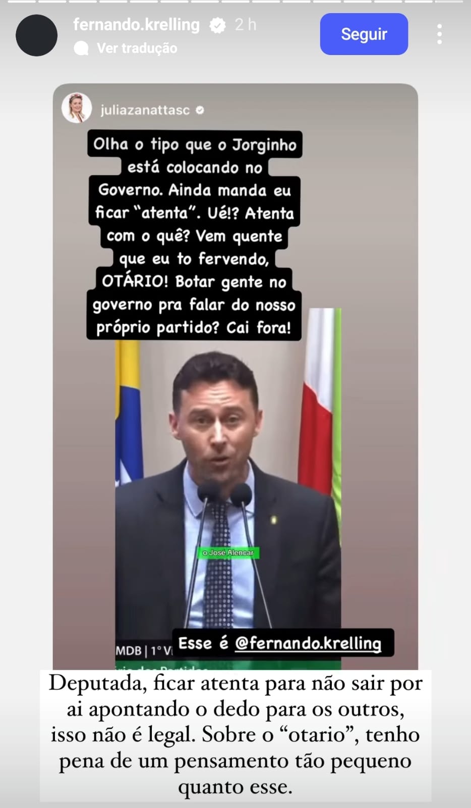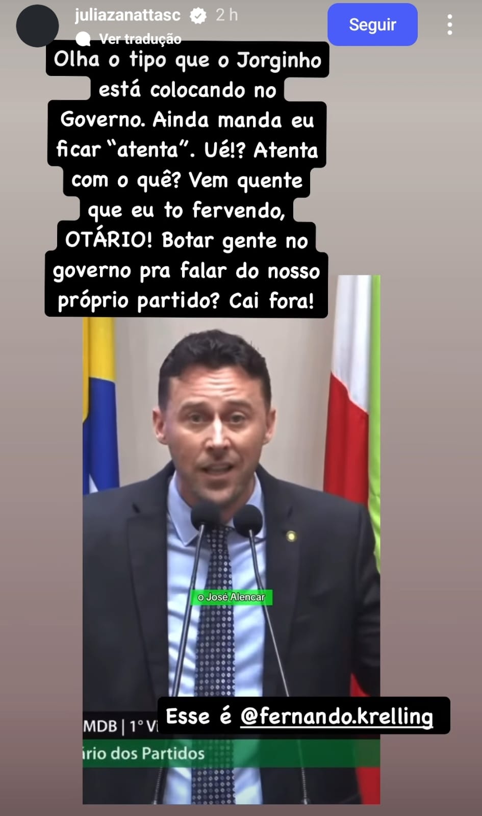 Em outro story no Instagram, a deputada escreveu: “Vem quente que estou fervendo, otário!.”Por fim, a deputado ‘parabenizou’ a escolha de Bion. “Parabéns, deputado Fernando e à todos da equipe do Jorginho Mello que não viram essa coisa ou viram?.”