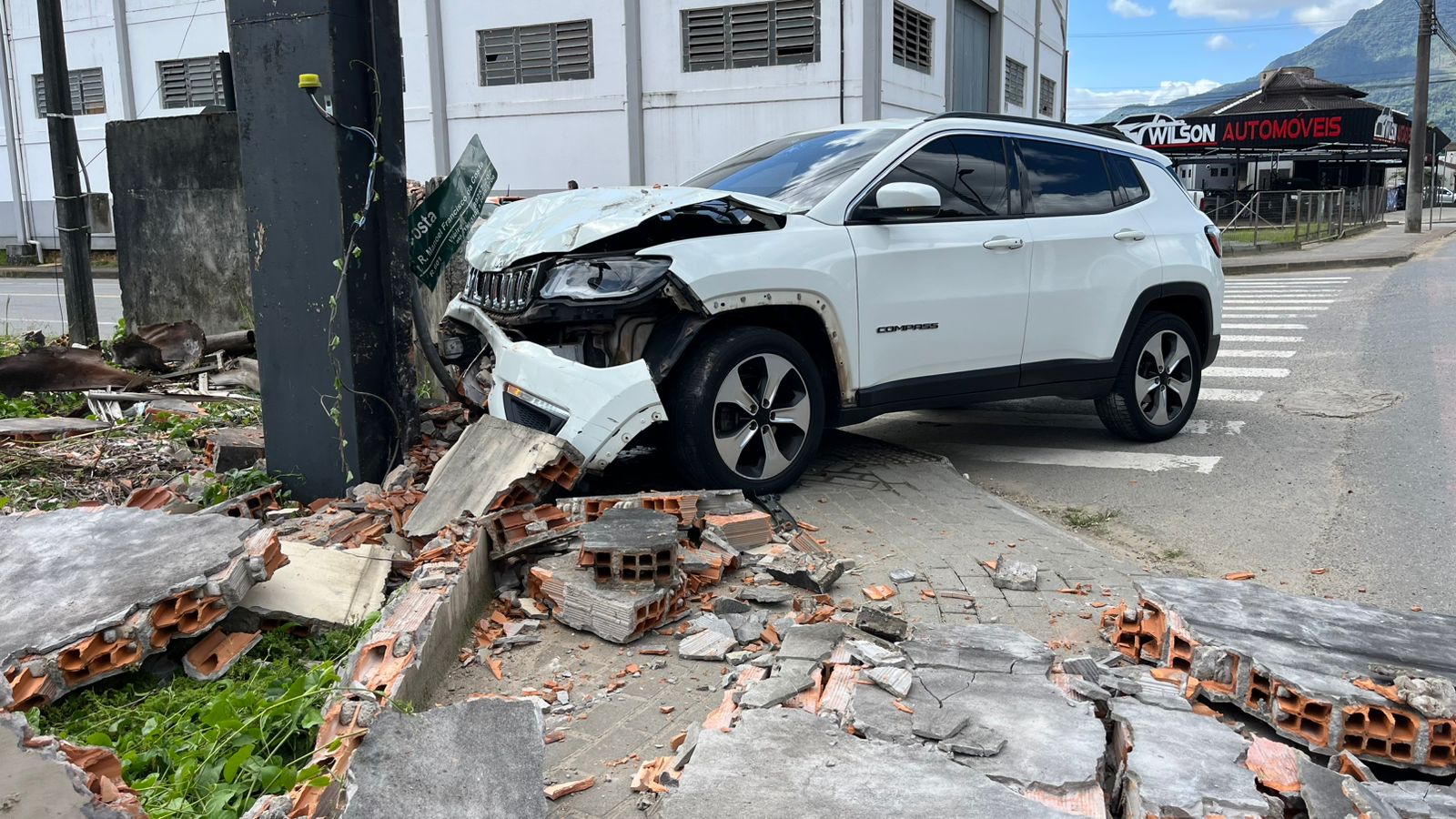 Na tentativa de escapar da perseguição, o motorista da BMW entrou na Rua Manoel Francisco da Costa esquina com Rua Guilherme Keller, no Vieira. O Jeep não conseguiu fazer a curva, passou reto e colidiu violentamente contra uma placa de sinalização e um muro.