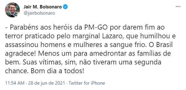 “Parabéns aos heróis da PM-GO por darem fim ao terror praticado pelo marginal Lazaro, que humilhou e assassinou homens e mulheres a sangue frio. O Brasil agradece! Menos um para amedrontar as famílias de bem. Suas vítimas, sim, não tiveram uma segunda chance. Bom dia a todos!”, comentou Bolsonaro.