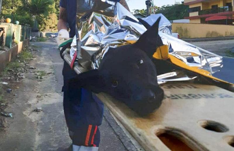 O motorista que atropelou a cadela deixou o local sem prestar ajuda. Ferido, o animal ficou caído na via. Foi aí que os bombeiros entraram em ação.