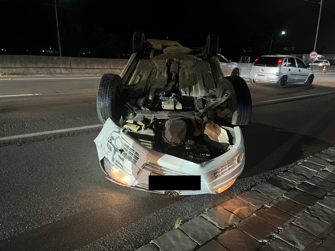 Na noite deste sábado, 6, por volta das 21h, um carro capotou após bater contra uma mureta na BR-280, em Guaramirim, próximo ao Komprão.