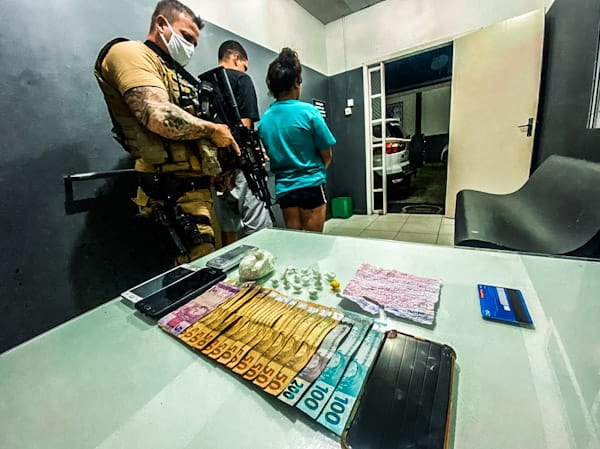 Próximo ao local da abordagem, foi localizada mais uma sacola com 100g de cocaína e uma balança de precisão escondidos perto de uma bananeira. Diante dos fatos, os autores foram detidos, sendo conduzidos à Delegacia de Polícia Civil para as providências cabíveis.