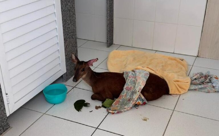 De acordo com o biólogo da Fujama Christian Raboch, moradores acionaram o serviço depois que o animal foi encurralado por cães que chegaram a morder uma das orelhas do animal. Desesperado, o cervo pulou para dentro de um açude de onde foi retirado por algumas pessoas que o colocaram dentro do banheiro de uma empresa até chegada da Fujama.