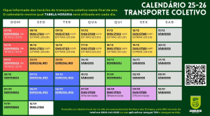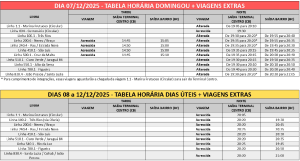 As alterações iniciam a partir do dia 07/12/25 (domingo) e vão até o dia 09/01/26 (sexta-feira). Nas imagens seguem as alterações e/ou acréscimos nas semanas dos dias 07 e 14 de dezembro. As tabelas horárias do dia 21/12/25 até 09/01/26 serão divulgadas na próxima semana, para que os usuários possam se programar com antecedência.