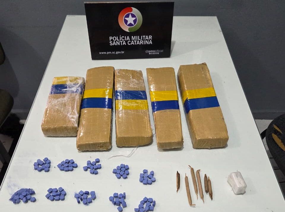 A Polícia Militar recebeu informação de que um veículo Renault Logan estaria transportando drogas em direção a Guaramirim pela rodovia. Policiais encontraram o carro, com duas pessoas, e abordaram na região do Bruderthal, encontrando quatro quilos de maconha e 100 comprimidos de ecstasy, cujo condutor — um homem de 30 anos — assumiu a propriedade.