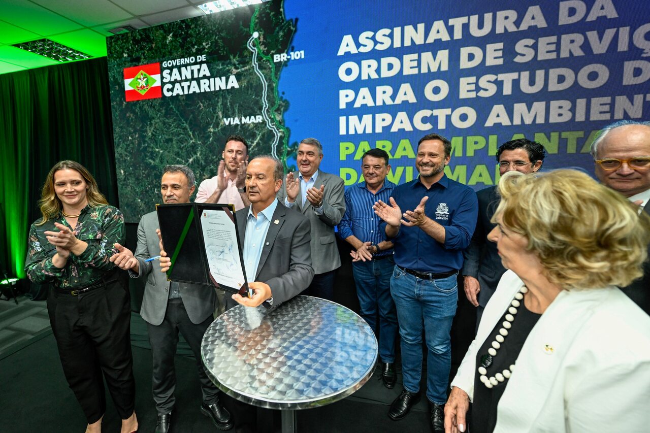 O governador Jorginho Mello assinou nesta segunda-feira, 24, em Joinville, a ordem de serviço para o Estudo de Impacto Ambiental (EIA/RIMA) da obra da Via Mar, o corredor alternativo à BR-101 no Litoral Norte. O levantamento é fundamental para definir o melhor traçado, garantir a compatibilização ambiental dos quatro projetos em desenvolvimento e viabilizar o licenciamento ambiental da proposta. A oficialização foi concretizada durante o evento O Norte encontra o Norte, na Associação Empresarial de Joinville (Acij).