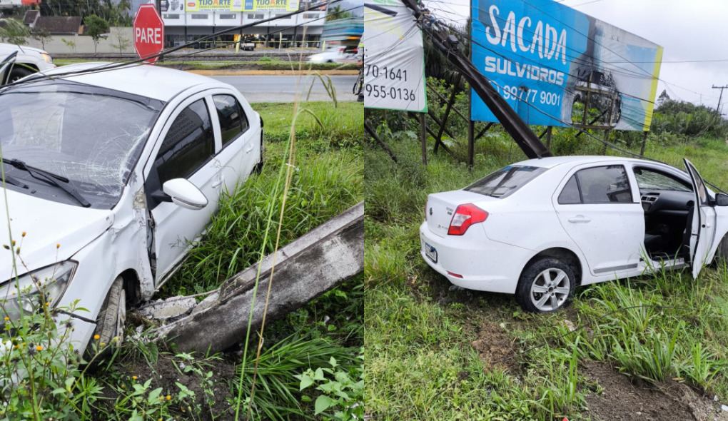 O acidente ocorreu na Avenida Prefeito Waldemar Grubba, próximo ao Posto Bogo, em Jaraguá do Sul. O carro derrubou o poste de sustentação da rede elétrica. Ninguém se feriu.