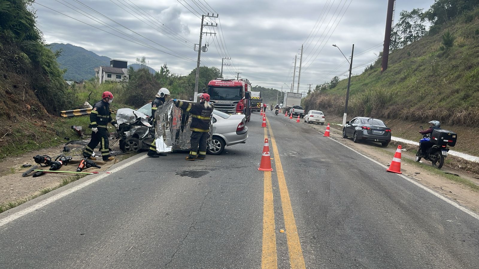 Os Bombeiros Voluntários foram acionados para o atendimento às vítimas. No Clio, os bombeiros fazem o atendimento do motorista.