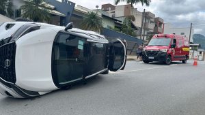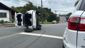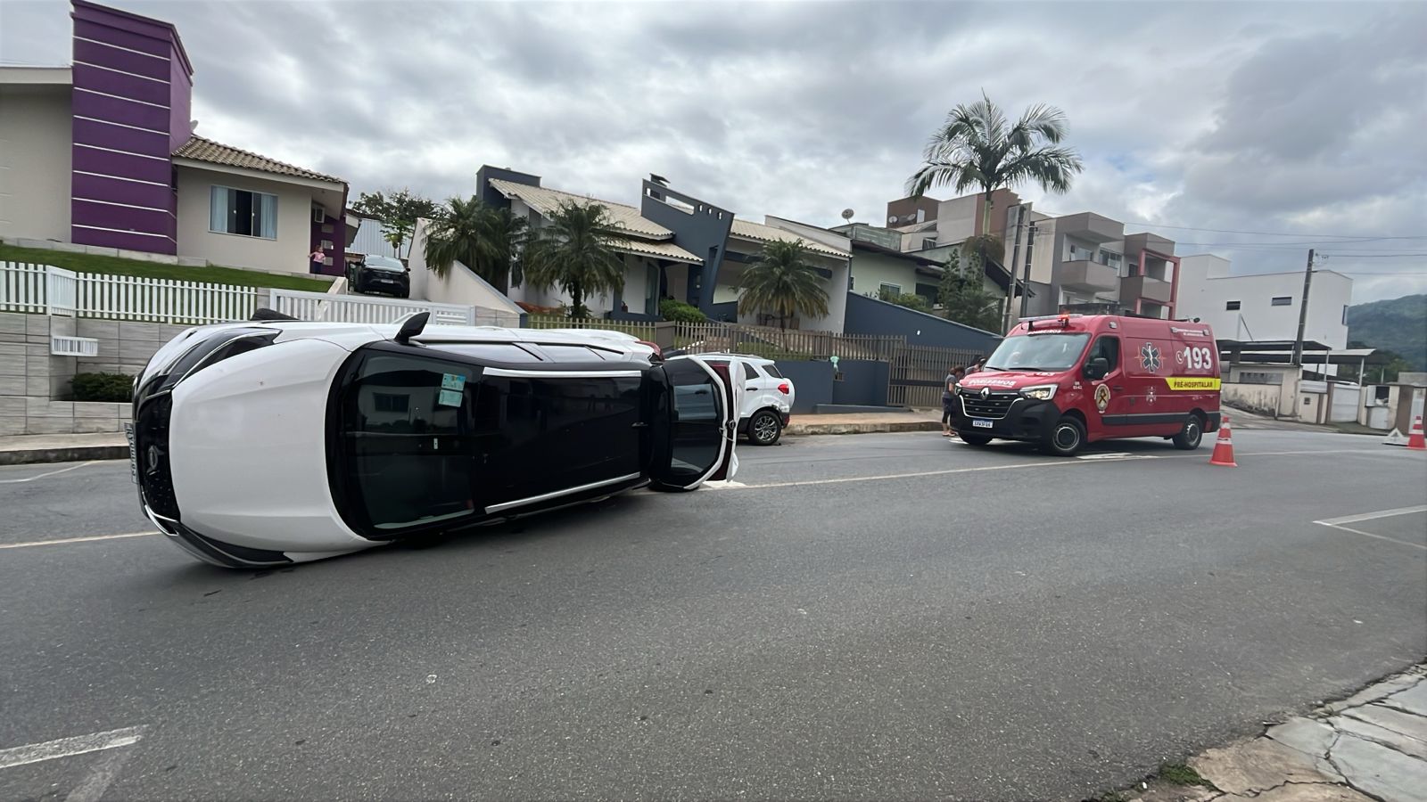 Na manhã desta segunda-feira (3), um carro tombou após colidir na traseira de outro veículo na rua Marcelo Barbi, no bairro Tifa Martins, em Jaraguá do Sul.