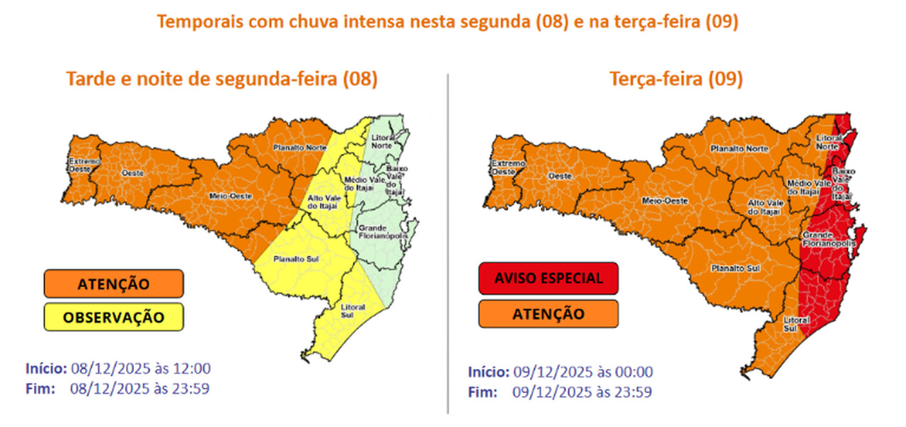 Conforme a Defesa Civil, o ciclone deve atingir Santa Catarina até quarta-feira (10). No Vale do Itapocu, a suspensão das aulas acontecerá apenas no período matutino e vespertino desta terça-feira (09), quando a região estará em alerta laranja.