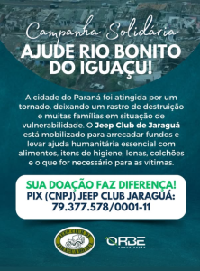 O Jeep Club de Jaraguá do Sul está arrecadando recursos para auxiliar moradores de Rio Bonito do Iguaçu, cidade do Paraná que foi atingida por um tornado na semana passada. Segundo a Defesa Civil, 90% da cidade ficou destruída.