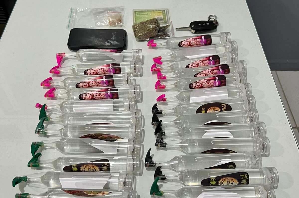 Durante patrulhamento, policiais militares perceberam um forte odor de maconha vindo de um veículo que seguia à frente da viatura. Na abordagem, foram encontradas várias pontas de cigarro de maconha no interior do automóvel. Sobre o banco traseiro havia uma bolsa preta contendo 23 frascos de substância semelhante a lança-perfume, além de dois invólucros de cristais de MDMA, conhecidos como “molly”, pesando cerca de 2 gramas.