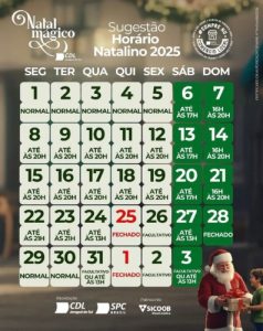 Na semana que antecede o Natal, o atendimento será ampliado. Nos dias 22 e 23, as lojas ficarão abertas até às 21h. No dia 24 de dezembro, véspera de Natal, o comércio funcionará até às 13h. No dia 25, feriado de Natal, não haverá atendimento.