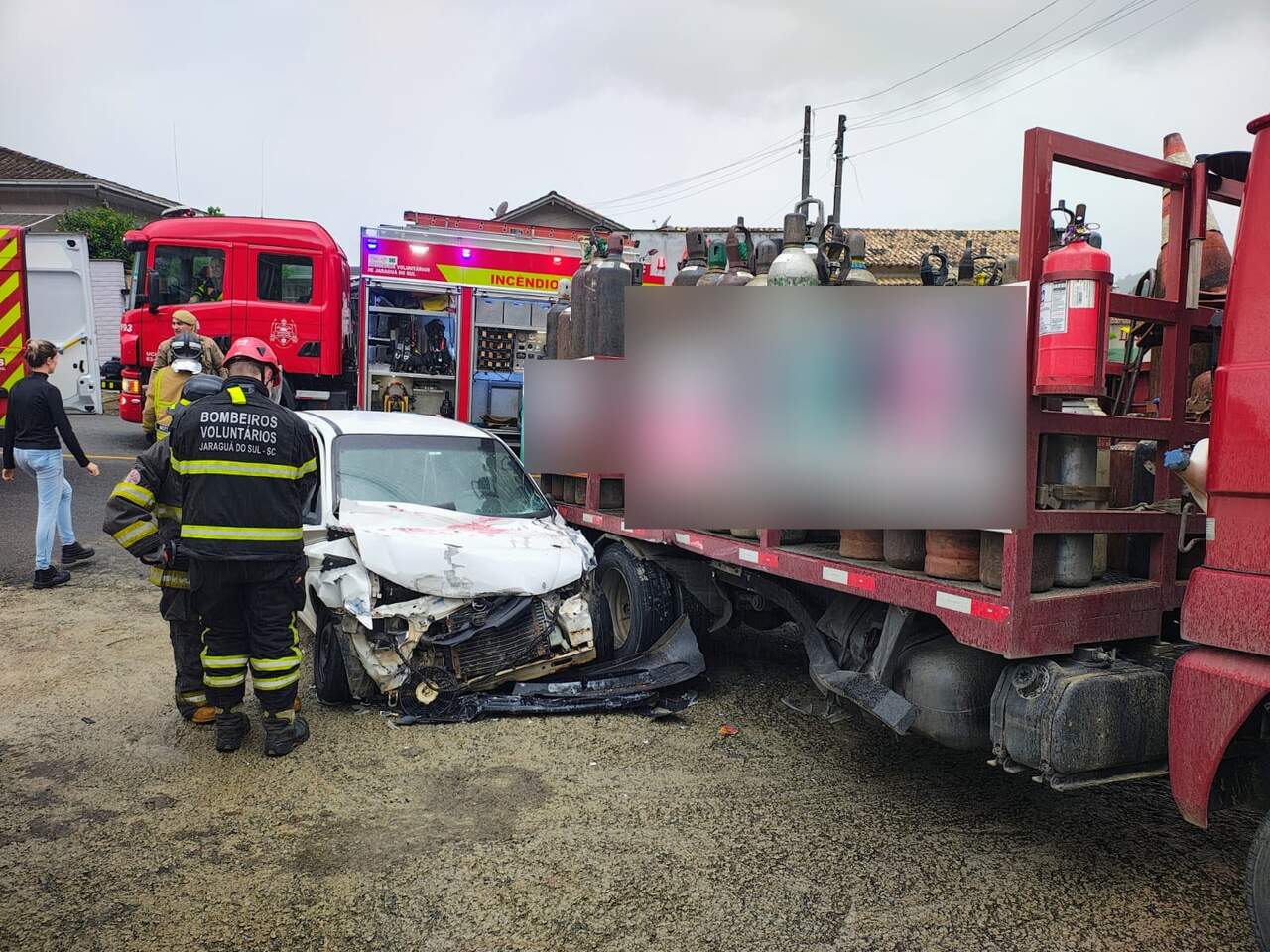 Um acidente entre um caminhão carregado de gás e um carro foi registrado na rua João Maass, no bairro Jaraguá 99, em Jaraguá do Sul. Colisão foi por volta das 16h15 desta quarta-feira (29).