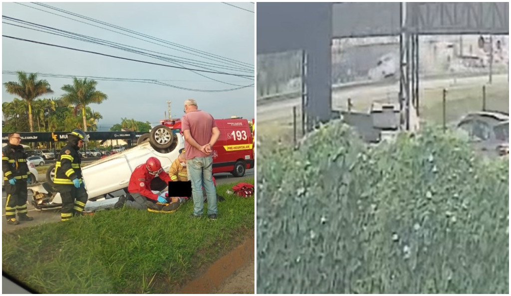Câmera de segurança flagrou o momento do acidente. O carro seguia sentido Guaramirim/Jaraguá quando foi atingido pelo caminhão. Com a batida, o carro capotou e parou na pista contrária da Avenida Prefeito Waldemar Grubba.