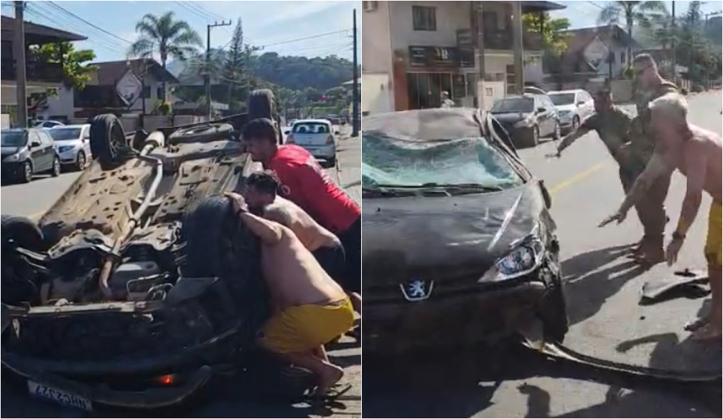 Um carro capotou após uma colisão na tarde deste sábado (6), na Rua Valdir José Manfrini, no bairro São Luís, em Jaraguá do Sul. O Corpo de Bombeiros Voluntários foi acionado por volta das 15h45 para atender a ocorrência, que envolveu dois automóveis.
