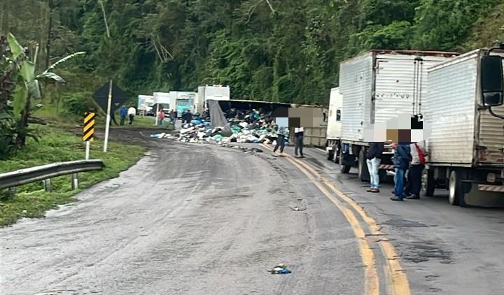 Na manhã desta quarta-feira (17), uma carreta tombou na BR-280, no Km 88, próximo a curva do britador, na serra entre Corupá e São Bento do Sul.