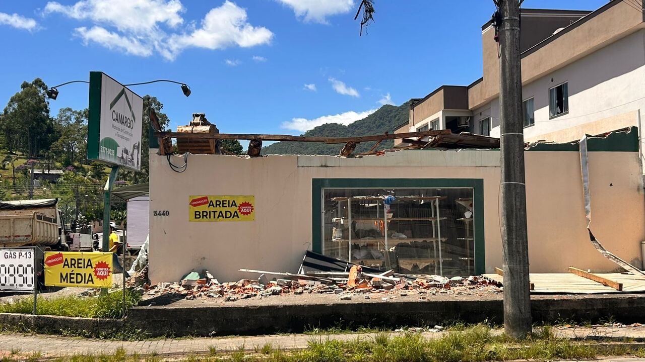 Antonio Carlos Camargo, conhecido como Camarguinho, e a esposa Vanessa passaram a manhã de quarta-feira (18) limpando os entulhos causados pelo vendaval que destruiu o telhado do material de construção Camargo, no bairro Amizade, em Jaraguá do Sul, na tarde de terça-feira (17).